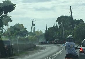 MAHINA, le 18 juin 2016. Un camion a accroché un câble électrique au PK9, à Mahina. Résultat : la circulation a été coupée pendant près d'une heure et des longs embouteillages ont eu lieu de chaque côté.
