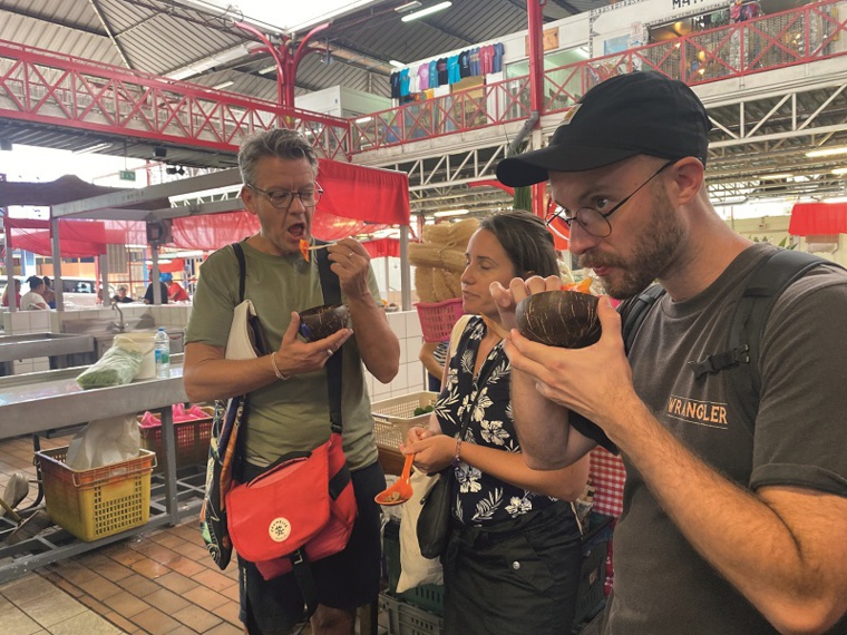 Kendall Hill, accompagné du directeur marketing de la société Ponant, propriétaire du Paul Gauguin, Charles Boutet, a rejoint Magalie Robin vers 9h30 ce mardi, directement dans le premier lieu de dégustation de ce “food tour", le Café Roti, tout proche de la mairie de Papeete. Au menu, pour s'ouvrir les papilles, le petit groupe a pu déguster des firifiri. Ces beignets typiques au lait de coco ont notamment beaucoup plu au journaliste australien. Après cette première étape, direction Tahiti Smoothies, où les deux hommes ont pu se désaltérer avec un très bon jus de fruits frais. “J'ai connu les food tour en métropole et c'est vrai que c'est quelque chose qui manquait à Tahiti”, a expliqué Magali Robin, en sortant du magasin. “J'avais envie de faire découvrir les plats typiques et l'histoire de la Polynésie à travers ça. Expliquer pourquoi on mange des chinoiseries et pourquoi il y a toute cette mixité ici.”