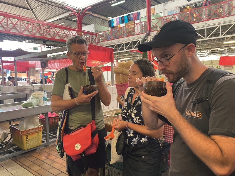 L'air ravi après cette halte sucrée, le groupe n'était pas encore au bout de ses surprises. En effet, ils s'apprêtaient à découvrir un haut lieu de la vie tahitienne et de la nourriture polynésienne : le marché de Papeete. Là, ils ont d'abord déambulé vers les stands de poissons, curieux de découvrir les korori et autre mahi mahi. “Les recettes tahitiennes à base de mahi mahi sont vraiment délicieuses”, devait alors glisser Kendall Hill. Après avoir écouté les explications de la vendeuse sur les bonnes façons de faire frire son poisson, les flaneurs gourmands se sont dirigés vers les étals de fruits et légumes. Ils ont pu y tester d'autres spécialités polynésiennes : les bonbons mangues et le mape. Un met qu'a notamment semblé apprécier Charles Boutet. Par la suite, les deux hommes ont pu gouter de l'eau de coco, mais également du poisson cru sous plusieurs formes accompagné de frites de ‘uru et de taro au Café Maeva à l'étage du marché. S'en est suivi un passage au restaurant Chez Jimmy pour tester des bouchons et samossas, un autre chez un glacier. Pour clôturer ce tour de plus de 3h30, Magali Robin propose habituellement une dégustation de rhums polynésiens au Meherio, mais sous “la chaleur excessive” de Tahiti, les deux hommes se sont rabattus sur une bière locale, un peu plus rafraichissante.