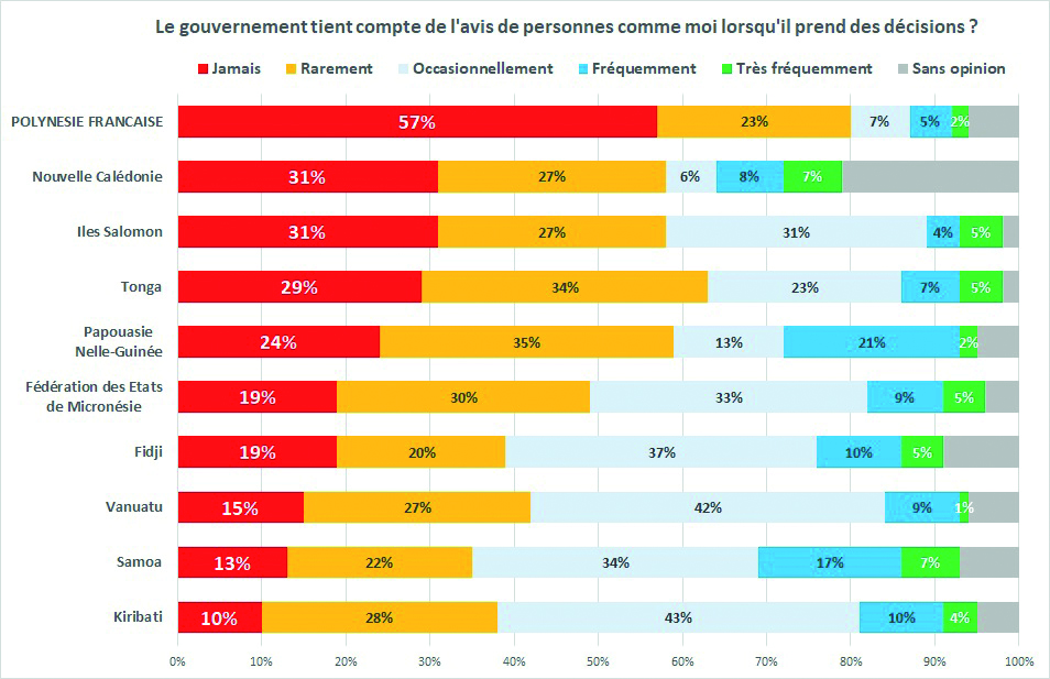 Autre question posée de portée générale, sans lien avec la crise sanitaire, celle de la participation aux prises de décision qui concernent le pays. Là encore, les résultats de l’étude sont sans appel et témoignent d’une population polynésienne se considérant manifestement à l’écart, marginalisée par les décideurs. Ainsi, à la question “le gouvernement tient compte de l'avis de personnes comme moi lorsqu'il prend des décisions”, près de six personnes interrogées sur dix (57%) en Polynésie ont répondu “jamais”, soit 26 points de plus que les territoires classés en deuxième position. Ils sont également 23% à avoir répondu que c’était rarement le cas. Ainsi, pour huit polynésiens sur dix, le gouvernement décide sans réelle consultation avec la population. Un record dans le Pacifique Sud. Logiquement, ils ne sont que 7% à penser que cette consultation est fréquente, voire très fréquente. Là aussi, un record, à savoir celui du plus bas pourcentage constaté dans la région. Un fossé démocratique apparent qui devra être comblé avant les prochaines échéances électorales…