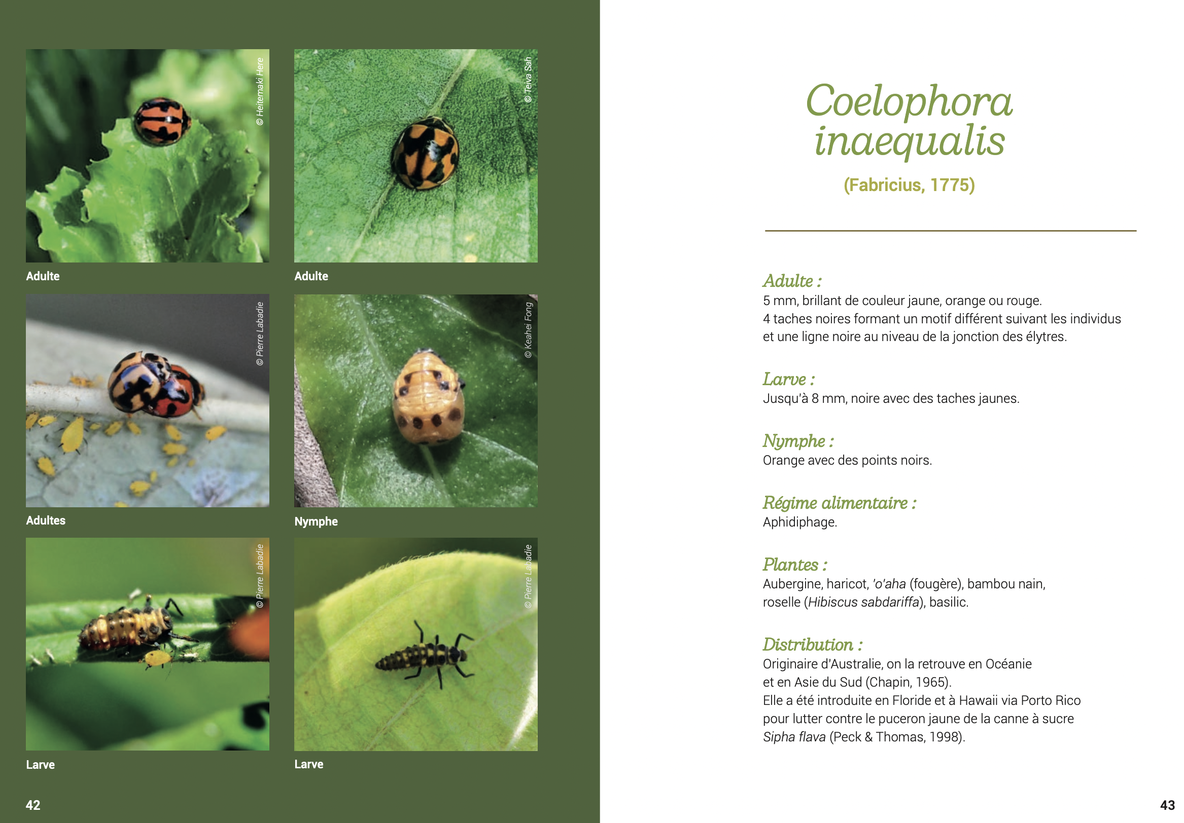 Le guide se poursuit avec l’intérêt écologique des coccinelles et la description de douze espèces ayant élu domicile à Tahiti, visibles à l’œil nu ou à l’aide d’une loupe. Au total, en Polynésie, il pourrait en exister 10 à 25 espèces. Pour l’heure, il s’agit d’une estimation. Mais un jour, peut-être, sortira un guide sur l’ensemble des coccinellidés. “C’est un projet”, annonce Élodie Cinquin-Beigbeder. Un de plus pour porter à la connaissance du plus grand nombre le maximum d’informations scientifiques.