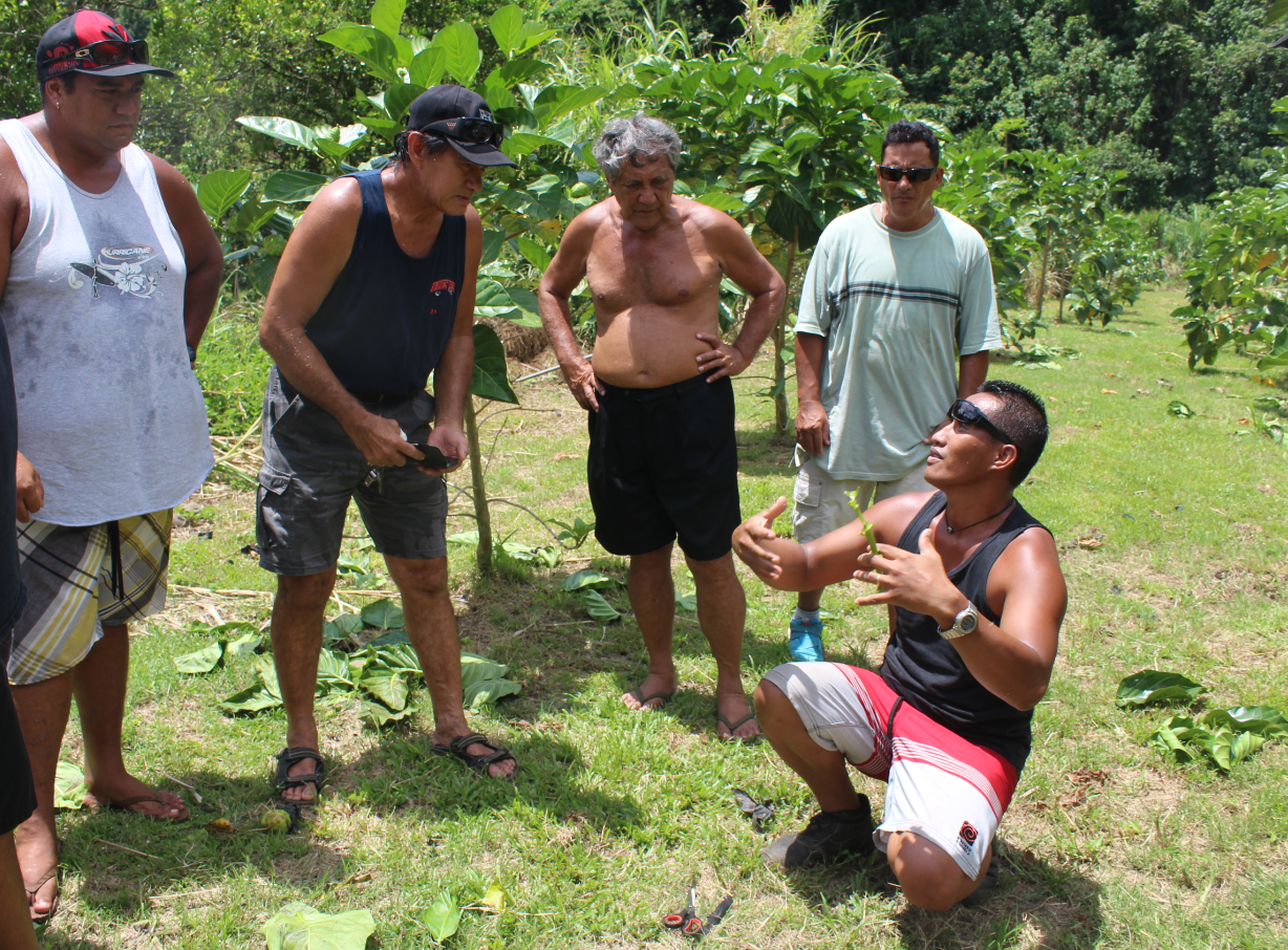 Si la plantation de noni de Jean-Baptiste Tavanae est bien plus majestueuse qu'un amphithéâtre d'université, l'ambiance y est tout aussi studieuse. Et pour cause, le jeune agriculteur qui a fait de sa passion pour le bio, son métier, donne un "petit cours" à d'autres cultivateurs sur la culture bio du noni, travaux pratiques inclus ! "Je conseille plutôt la technique du bouturage par rapport à celle des semences. Il faut sélectionner des boutures qui semblent en bonne santé, ainsi elles pousseront plus vite, cela permet de gagner pas mal de temps", explique Jean-Baptiste à la tête de 154 plants de noni bio, à une petite dizaine d'agriculteurs venus découvrir les techniques du jeune homme.