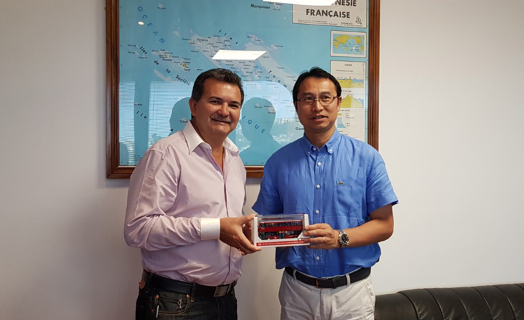 Le ministre de l’Equipement et des Transports terrestres, René Temeharo, a rencontré, jeudi, le vice-président de BYD, Liu Xueliang, accompagné de son responsable régional Asie - Pacifique, Benjamin Zhao et du représentant du constructeur chinois BYD (Build Your Dreams) en Polynésie, Daniel Siu.