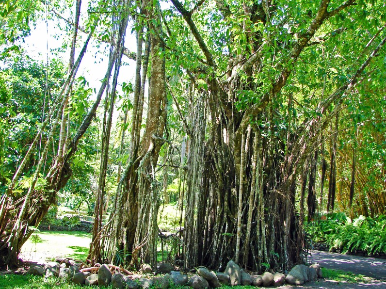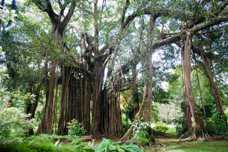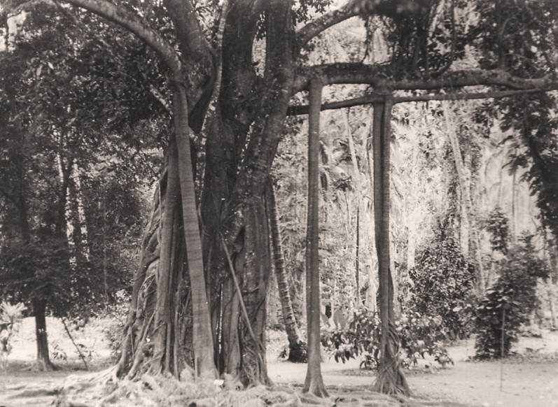 En 1936, Harrison Smith planta la graine de ce banian qui avait été acheté chez le grainetier Vilmorin au bord de la Seine à Paris. L'arbre a grandi et est devenu le plus grand du jardin botanique avec un diamètre de plus de 70 mètres. Des racines descendent des branches de tous côtés jusqu'au sol pour y former de nouvelles bases à l'arbre. Petit à petit, ces racines prendront corps et remplaceront le cœur de l'arbre actuel qui dépérira. (Photo : le banian en 1970)