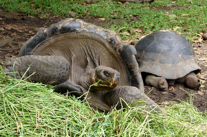 Les deux tortues du jardin botanique font partie des plus grosses tortues vivantes. Elles pèsent chacune environ 200 kilos, mesurent 1,50 m et se déplacent à 3 km/h. Ce sont des herbivores qui se nourrissent de feuillage, d'herbes et de fruits. Elles sont dotées d'un très bon odorat et sentent leur nourriture avant de la manger. Les tortues du jardin botanique furent offertes en 1928 à un yachtman américain Charles Nordhoff qui naviguait des îles Galapagos à Tahiti.