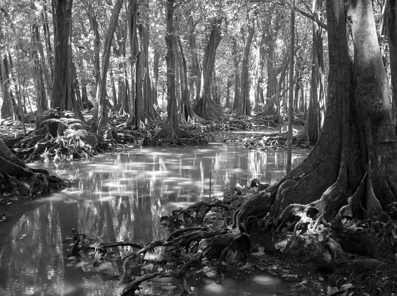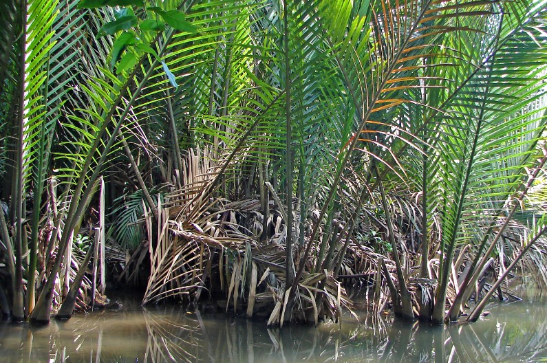 Le palmier nypa, est l'un des palmiers les plus extraordinaires, par sa manière de pousser comme par ses inflorescences et ses fruits. Il produit une racine souterraine, ou plutôt « sous vase », qui pousse horizontalement. Les grosses graines sont regroupées par grappe de la taille d'un ballon de football.