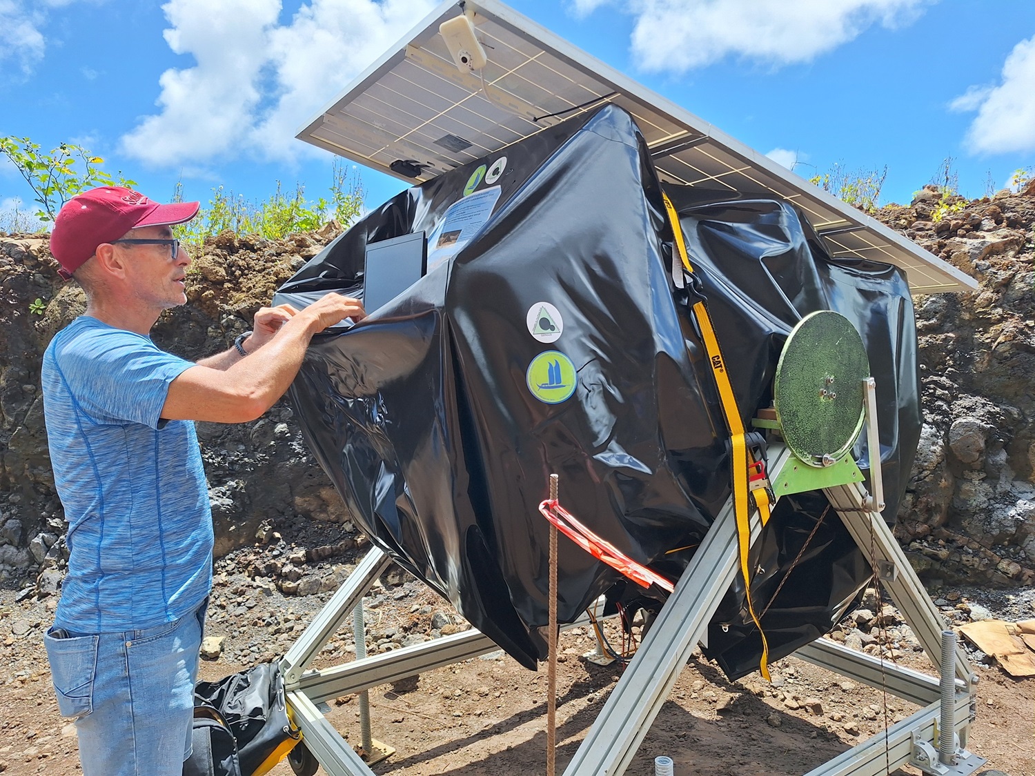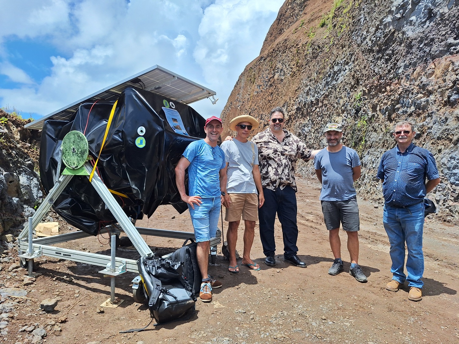 L’image a des allures de mission sur Mars, mais c’est bien au pied du talus du PK 43, à Hitia’a, qu’un détecteur à muons a été installé, il y a quelques jours, dans le cadre des recherches scientifiques menées par Jean-Christophe Ianigro et Jacques Marteau de l’Institut de physique des deux infinis (IP2I) de Lyon, en lien avec le CNRS et en partenariat avec Fayçal Rejiba du laboratoire des Milieux environnementaux, transferts et interactions dans les hydrosystèmes et les sols (METIS) de la Sorbonne, à Paris, ainsi que Jean-Martial Mari et Keitapu Maamaatuaiahutapu de l’Université de la Polynésie française (UPF), via le laboratoire de géosciences du Pacifique sud (GEPASUD).
