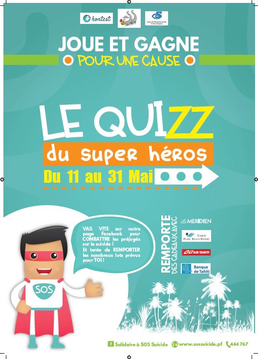 PAPEETE, 11 mai 2015 - L’association SOS Suicide organise un jeu concours, du 11 au 31 mai, afin d’informer sur l’acte suicidaire et lutter contre les idées reçues au sujet des personnes qui passent à l’acte. Chez les 15-44 ans, le suicide est la 1ere cause de mortalité en Polynésie française.
