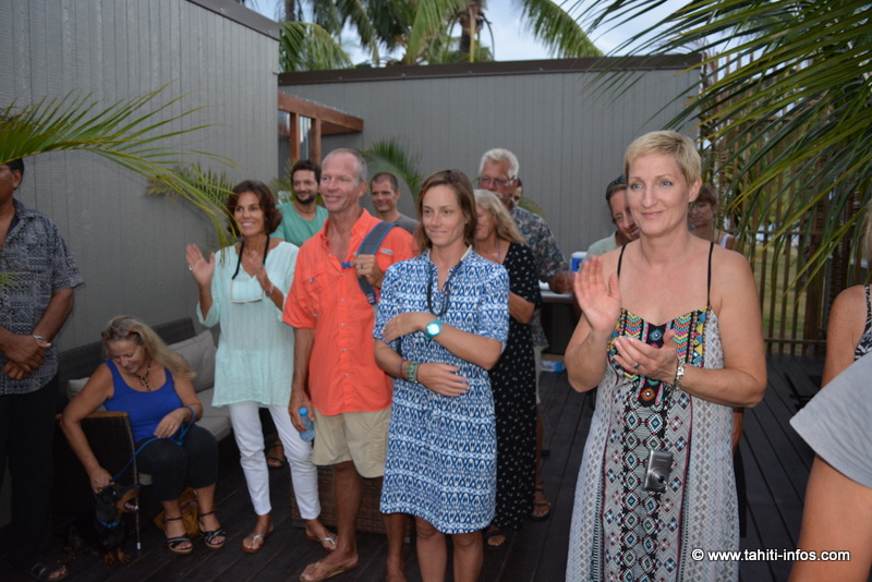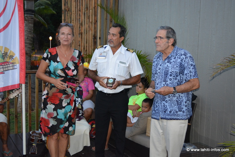 Stéphanie Betz (qui organisait un cocktail de bienvenue au nom de la Mairie de Papeete et de Tahiti Tourisme), François Chaumette (capitaine du Port) et Jimmy Cornell (organisateur de la Blue Planet Odyssey) ont échangé de petits cadeaux.