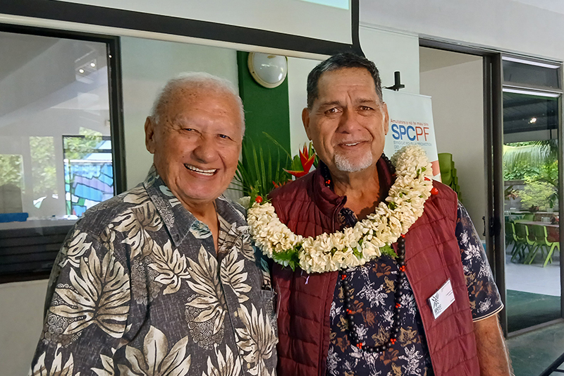 Cyril Tetuanui (à droite) fraîchement réélu à la tête du SPC/PF et félicité par le doyen d'âge qui présidait la séance, Raymond Voirin (à gauche), maire de Fangatau. crédit photo SD
