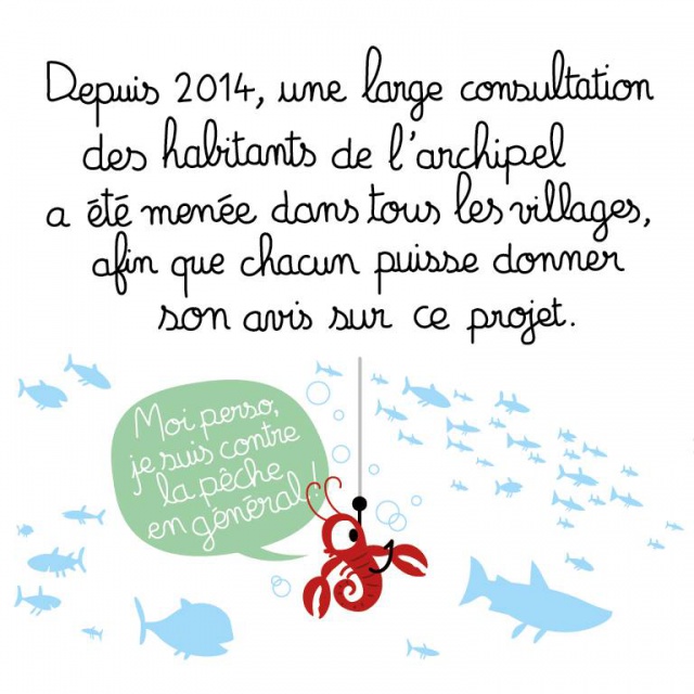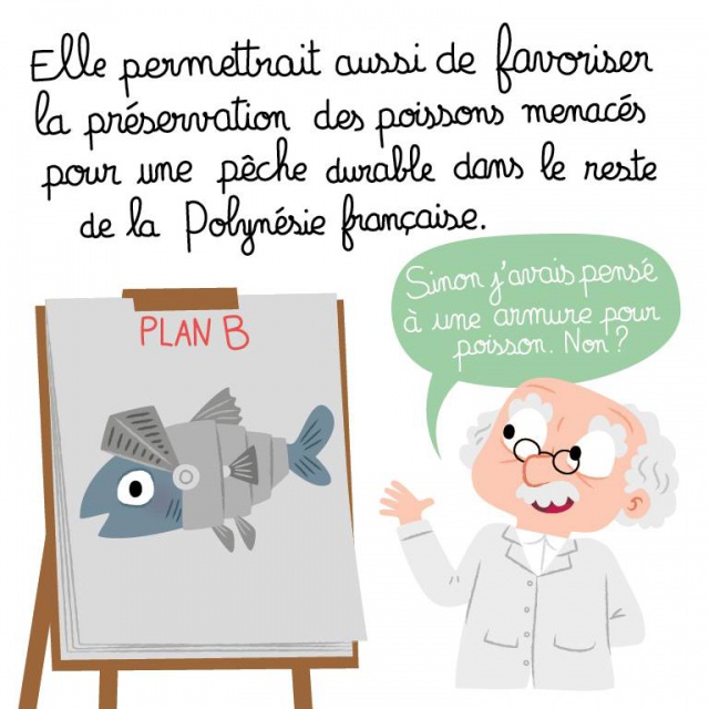 Ce sont plusieurs dessins qui décrivent la vie dans nos lagons, avec des ressources marines qui sont encore disponibles pour nourrir les habitants. Mais cette BD alerte également les lecteurs sur les probables difficultés que nous pourrions rencontrer si nos océans venaient à se vider, à cause de la surpêche.