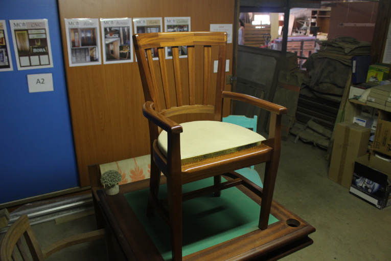 La chaise compte parmi les objets de menuiserie les plus compliqués à réaliser. "Il y a de nombreux éléments à travailler séparément, puis à assembler, pas moins de huit. On usine le bois, on le ponce, on le rabote puis on le coupe aux bonnes dimensions." Les pièces des accoudoirs et du dossier sont, elles, cintrées. Le tout est poncé, puis vernis.