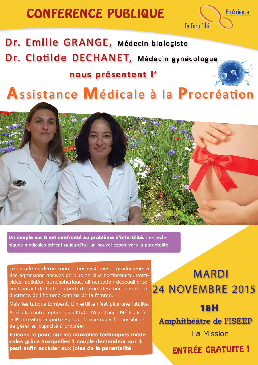 L'association Proscience – Te Huru 'Ihi organise une conférence sur l'assistance médical à la procréation ce mardi dans l'amphithéâtre de l'Institut supérieur de l'enseignement privé (Isepp). Elle sera animée par la biologiste Émilie Grange et la gynécologue Clothilde Dechanet qui exercent au centre d'assistance médicale à la procréation à Nouméa. Les deux professionnelles parleront de leur spécialité et présenteront les techniques médicales proposées aux couples confrontés à un problème d'infertilité.