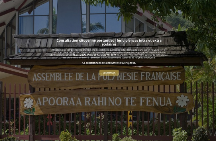 C'est dans ce cadre que les deux rapporteures de la mission, Chantal Galenon, par ailleurs présidente de la commission, et Romilda Tahiata, ont souhaité ouvrir une consultation citoyenne afin de permettre à la population de donner son avis sur la thématique des violences au sein et à l'extérieur des établissements scolaires de Polynésie française. Le public peut répondre de manière anonyme à un questionnaire sur le sujet, accessible jusqu'au 21 juin, en ligne sur le site de l'assemblée ou sur la page Facebook de l'institution. Cette consultation intervient une semaine après le lancement d'une précédente consultation citoyenne qui porte sur l'accès aux archives publiques.