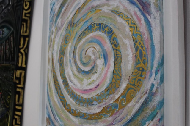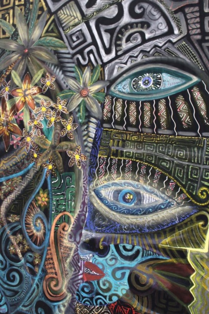 Nadège Gabbero a choisi une approche sensorielle. Elle a mélangé des matières sur ses toiles : poudre de marbre, papier de soie, sables, teintures ou encore des fibres végétales. Ces multiples médias et techniques utilisés font ressortir des signes, des motifs et symboles propres à la Polynésie qui l’a vu grandir.