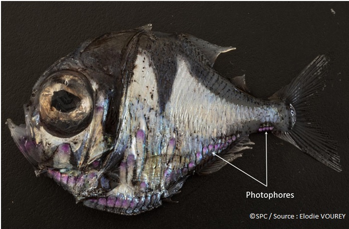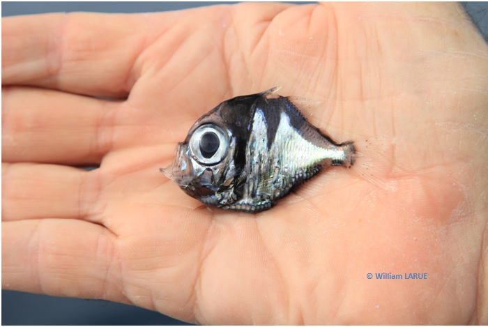 Les deux pêcheurs ont confié ce petit poisson argenté à l’IRD puis c’est la Communauté du Pacifique Sud (CPS) qui s’est chargée de l’identification : il s’agit d’un poisson-hachette de la famille des Sternoptychidae. Cette famille appartient au micronecton, organismes marins mesurant de 2 à 20 cm. Ils se nourrissent de petits poissons, crustacés et mollusques vivent principalement entre 200 et 2000 m de profondeur. C’est pourquoi il est extrêmement rare d’observer ce genre d’individu à la surface de l’eau, et c’est probablement un banc de dauphins qui a chassé ce poisson vers la surface.