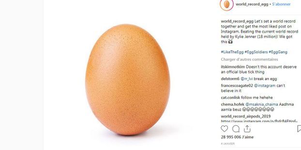 "Etablissons ensemble un record du monde du plus grand nombre de likes sur Instagram. Battons le record du monde établi par Kylie Jenner (18 millions)! On va y arriver", disait le message accompagnant la photo de l'oeuf, le seul "post" du compte.