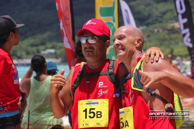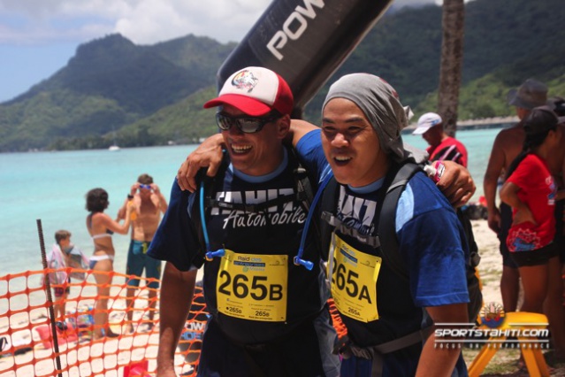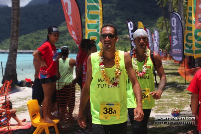 A ce jeu, et malgré la présence du duo Georges Richmond/Pascal Adams, ce sont les frères Nahei, Tupou et Davis, de l’entreprise Maruhi, qui franchissent la ligne d’arrivée les premiers en 52’15s. Le duo Roger Kong Yek Fhan Roger / Hervé Herani, de la brasserie, prennent la seconde place en 53’31s. Et le binôme, Pierre Dalbello et Manu Tiaahu, du collège de Paopao, complète le podium en 53’40s.