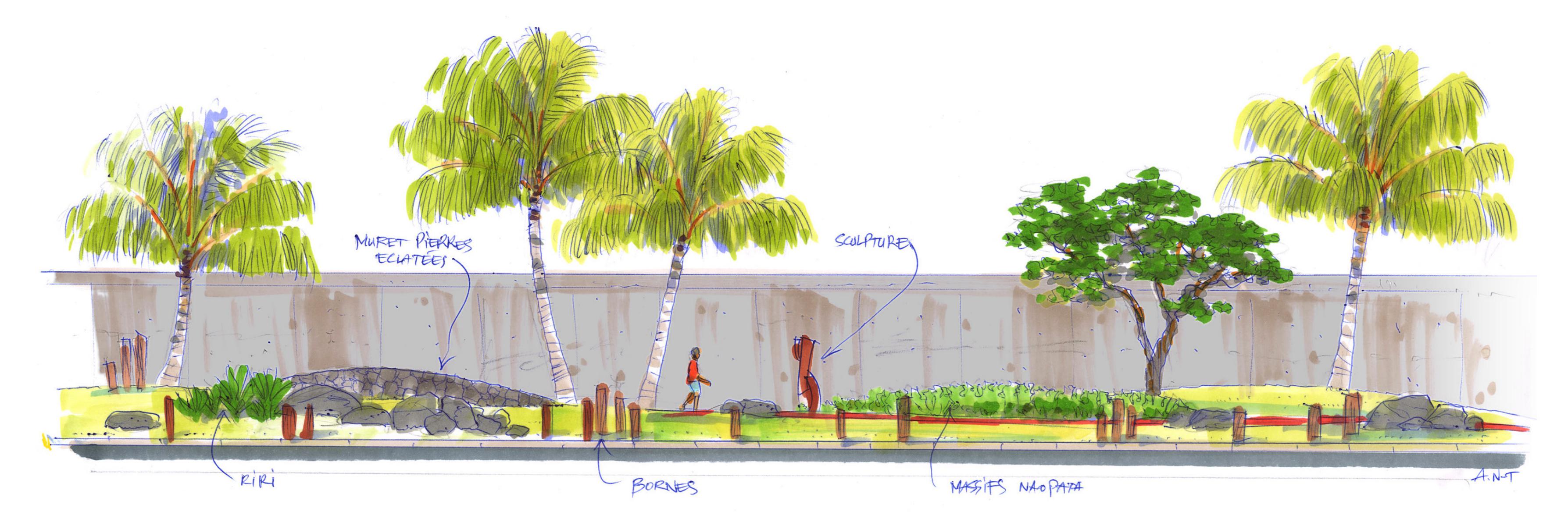 La zone concernée s’étend sur 1,3 kilomètre, de l’entrée sud du pont de Fare Ute jusqu’à la fin de la digue ouest (passe de Toata). Une attention particulière a été portée à l’aspect écologique du projet. Ainsi, il est prévu que des arbres endémiques comme le miki miki ou le naupata soient plantés. Le revêtement de sol sera réalisé à base de verre recyclé.