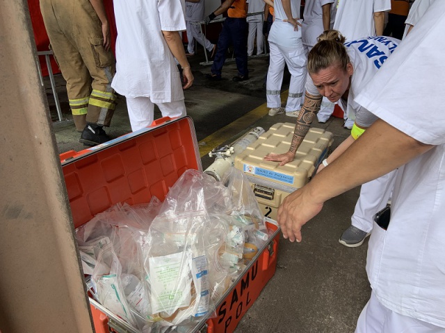 “Là, pour cet exercice, on va loin dans le scénario car chaque blessé et victime virtuels avaient un script détaillé sur lui et avait été briefé sur ce qu'il devait jouer. Chacun jouait la blessure qui lui avait été attribuée. Après, nous, on sait gérer les victimes. Notre travail de tous les jours, c'est de devoir prendre en charge une ou deux victimes sur un accident. Ce n'est pas la pathologie le problème, c'est le nombre de victimes et l'organisation. Car on ne peut pas envoyer 149 personnes à l'hôpital en même temps. On doit les stabiliser, les conditionner puis organiser leur transfert vers les structures médicales. Ce type d'exercice nous prépare spécifiquement à ce scénario.”