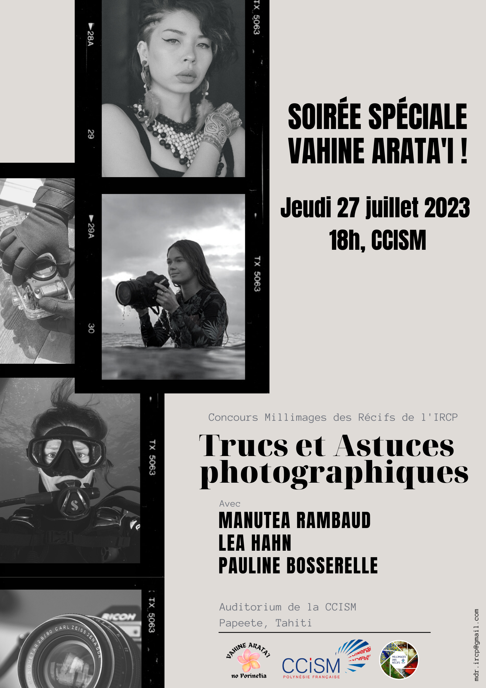 TAHITI, le 24 juillet 2023 - Dans le cadre du concours photo Millimages des Récifs organisé par l’Institut des récifs coralliens du Pacifique (IRCP) une soirée est organisée à l’attention des vahine qui souhaitent en savoir plus sur la prise de photographies. Cette soirée sera animée par trois invitées spécialisées chacune dans leur domaine.