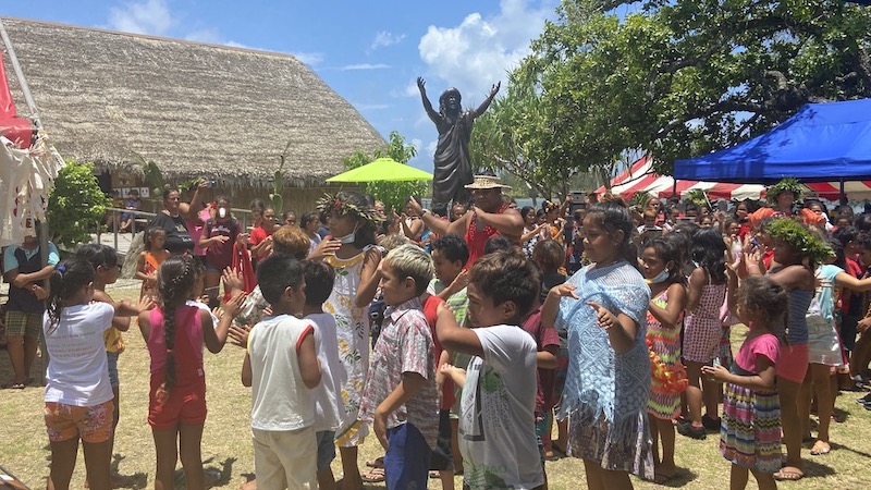 Huahine, le 28 janvier 2022 – Privés de sorties depuis deux ans en raison de la crise sanitaire, les petits écoliers de Fare et Maeva-Faie sont allés à la rencontre de la statue de bronze de Bobby Holcomb exposée temporairement à Huahine.