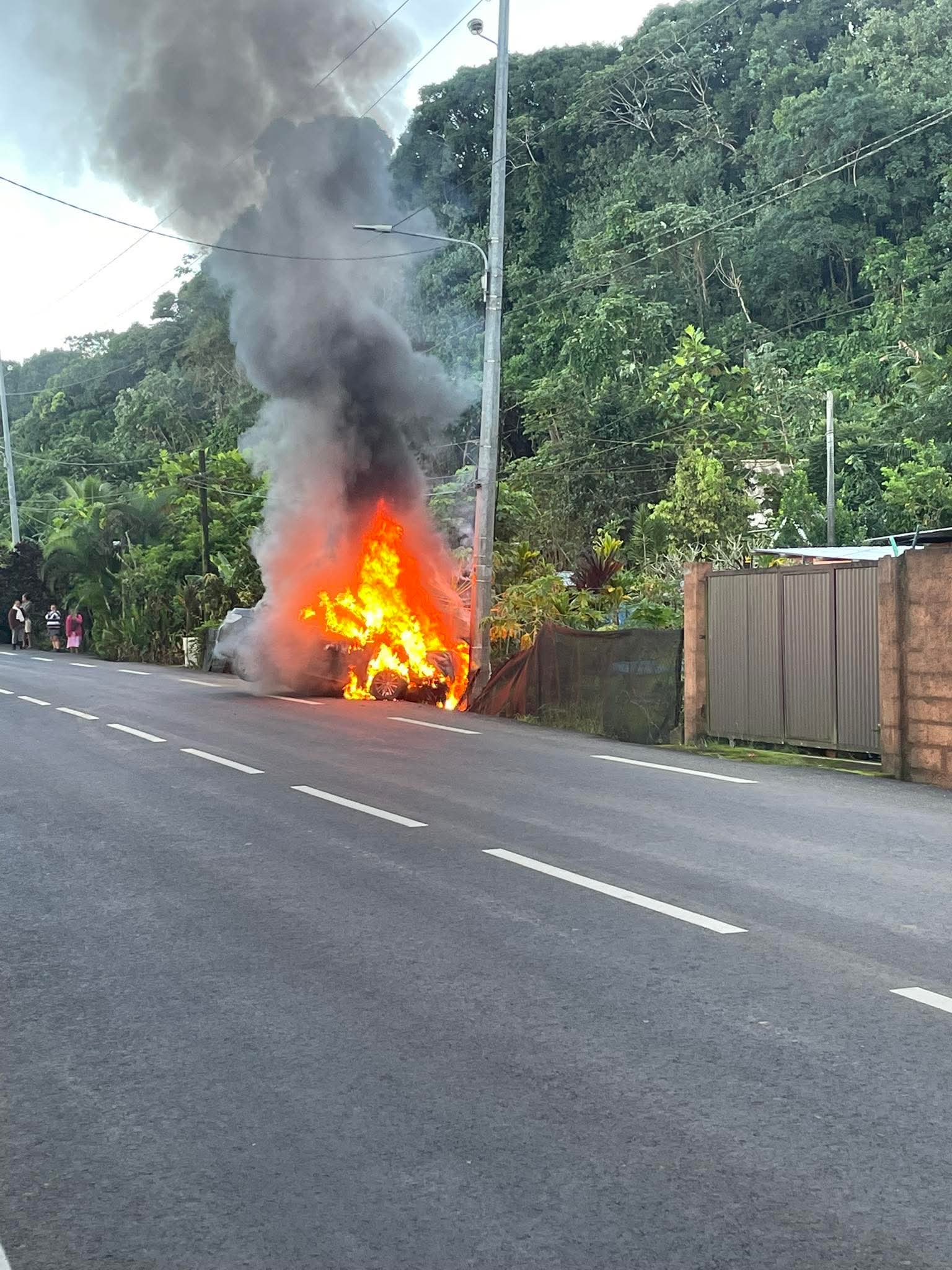 Tahiti, le 14 juin 2025 – Une voiture a percuté un poteau électrique avant de s'enflammer, ce samedi matin. Selon les premières informations, les deux personnes à bord ont pu sortir à temps. Une coupure de courant impacte le secteur.