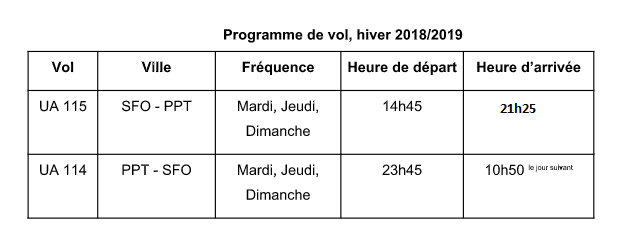 Les horaires des vols seront opérés les mardis, jeudis, dimanches au départ de San Francisco à 14 h 45 avec arrivée à Tahiti à 21 h 25 (UA 115) puis au départ de Tahiti-Faa'a à 23 h 45 pour une arrivée à San Francisco à 10 h 50 le lendemain (UA 114).
