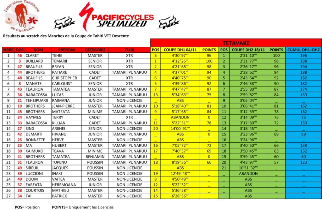 Punaauia, le dimanche 18 novembre 2012. Tehei Claret devance de 53 centièmes de seconde Temarii Buillard pour cette deuxième manche de la coupe de Tahiti de VTT descente (Downhill), discipline qui se développe sous l’égide de la fédération tahitienne de cyclisme.