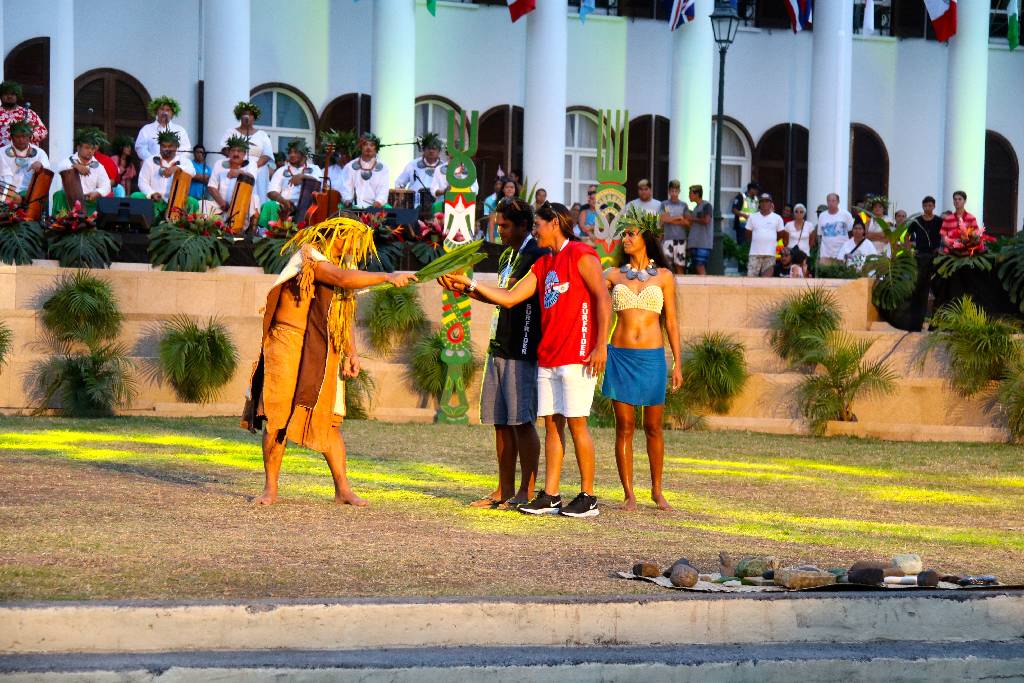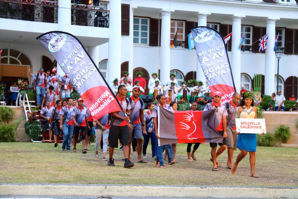Les délégations des différents pays avaient rendez vous au complexe sportif de Fautaua. Elles se sont ensuite dirigées à pied vers la Mairie de Pirae où elles étaient attendues dans les jardins de l’hôtel de ville de Pirae par les invités. Les délégations étaient toutes menées par une danseuse du groupe Hei Tahiti portant un panneau indiquant le pays d’origine de la délégation.