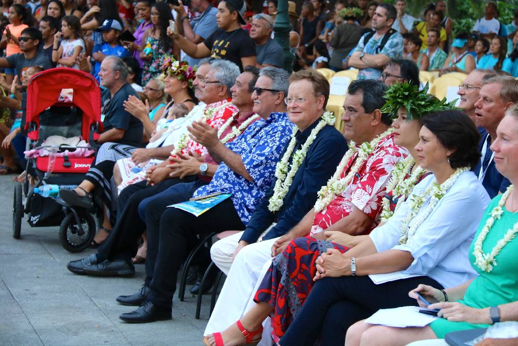 Parmi les officiels présents, on citera le président du Pays et maire de Pirae Edouard Fritch, le Haut Commissaire René Bidal, Lara Collins la présidente de la fédération internationale de va’a, le Ministre du Tourisme Jean Christophe Bouissou, Michel Buillard le Maire de Papeete, Luc Faatau le Ministre de l’équipement et bien sûr les représentants du comité organisateur local (COL).