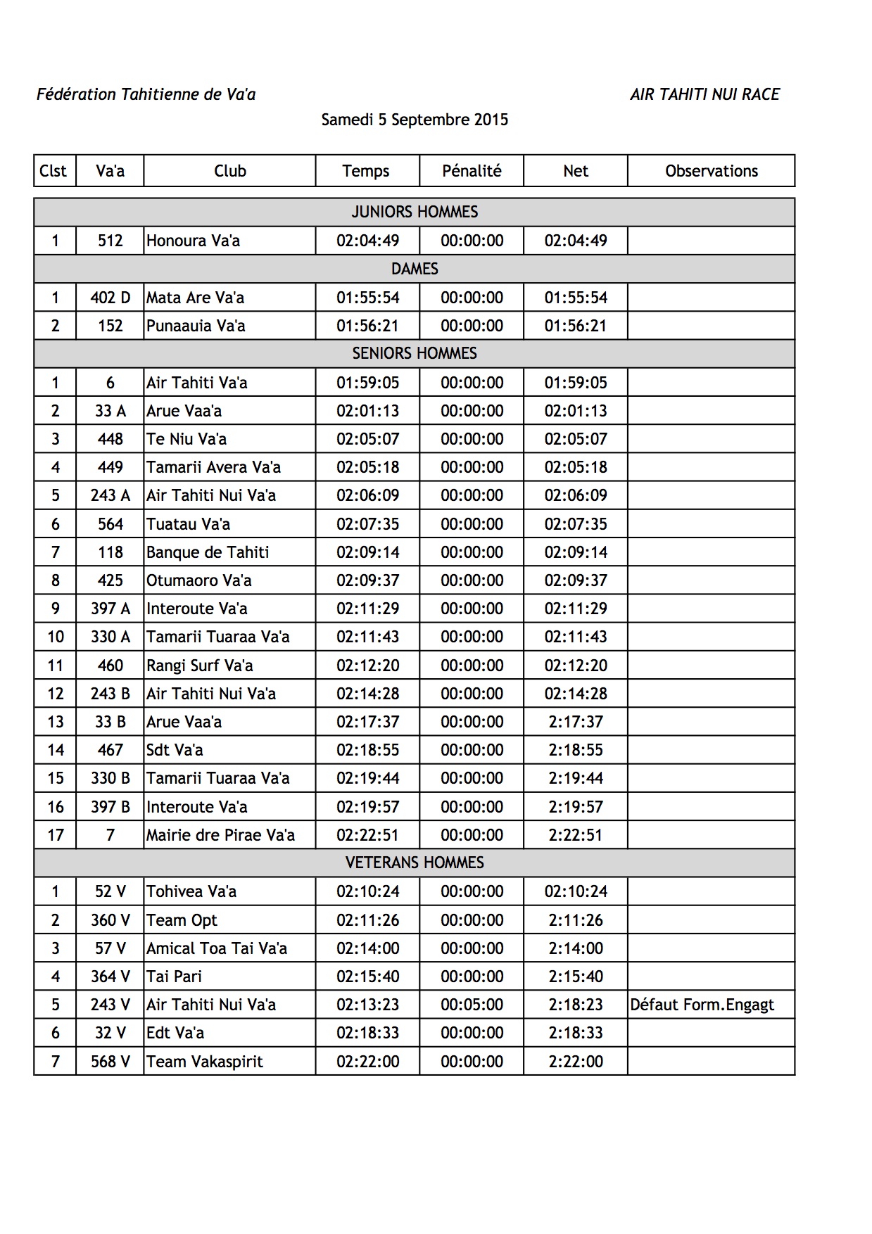 Une trentaine de pirogues ont pris le départ, toutes catégories confondues. Chez les femmes c’est Mata Are Va’a qui s’est imposée, chez les vétérans c’est Tohivea Va’a qui s’impose devant team Opt et l’Amicale Toa Tai Va’a. Il n’y avait qu’une pirogue junior : Honoura Va’a. La participation chez les femmes et les juniors a été timide.
