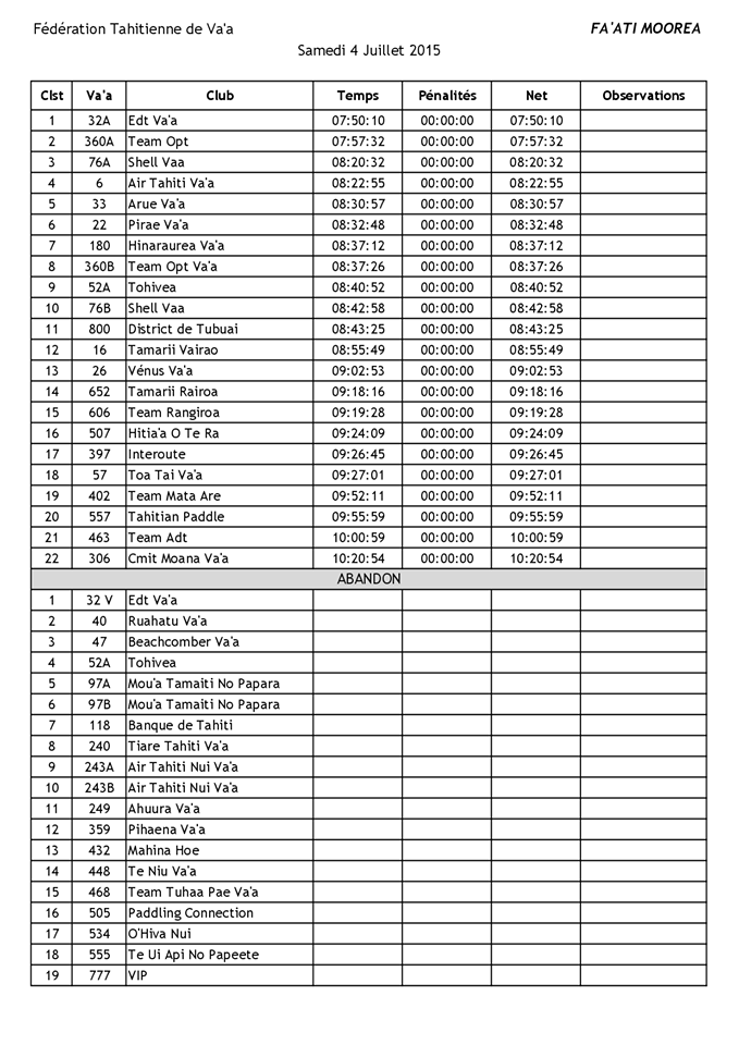 Dans le Top 10 de cette course de tous les dangers, on retrouve Air Tahiti, Arue Va’a, Pirae Va’a, Hinaraurea, Team Opt B, Tohivea et Shell B. La 2e pirogue Edt Va’a fait partie des 19 pirogues qui ont abandonné, comme Paddling Connection, les deux pirogues d’Air Tahiti Nui, Ruahatu, Beachcomber Va’a, les deux pirogues Mou’a Tamaiti ou encore la pirogue Banque de Tahiti.