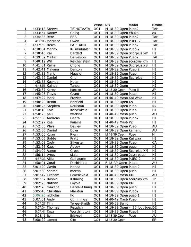 Rete Ebb a mené la course, suivi de Steeve Tehiota’ata et Danny Tching mais il finit par chuter. C’est Steeve Teihota’ata qui s’impose finalement. La Molokai Solo est le rendez vous de l’année pour la course en pirogue à une place, appelée aussi V1. A noter la bonne 4ème place du champion de Huahine Manutea Owen, la 5ème place de Heiva Paie-Amo et la 8ème place d’un autre grand champion de Huahine, Maitai Danielson.