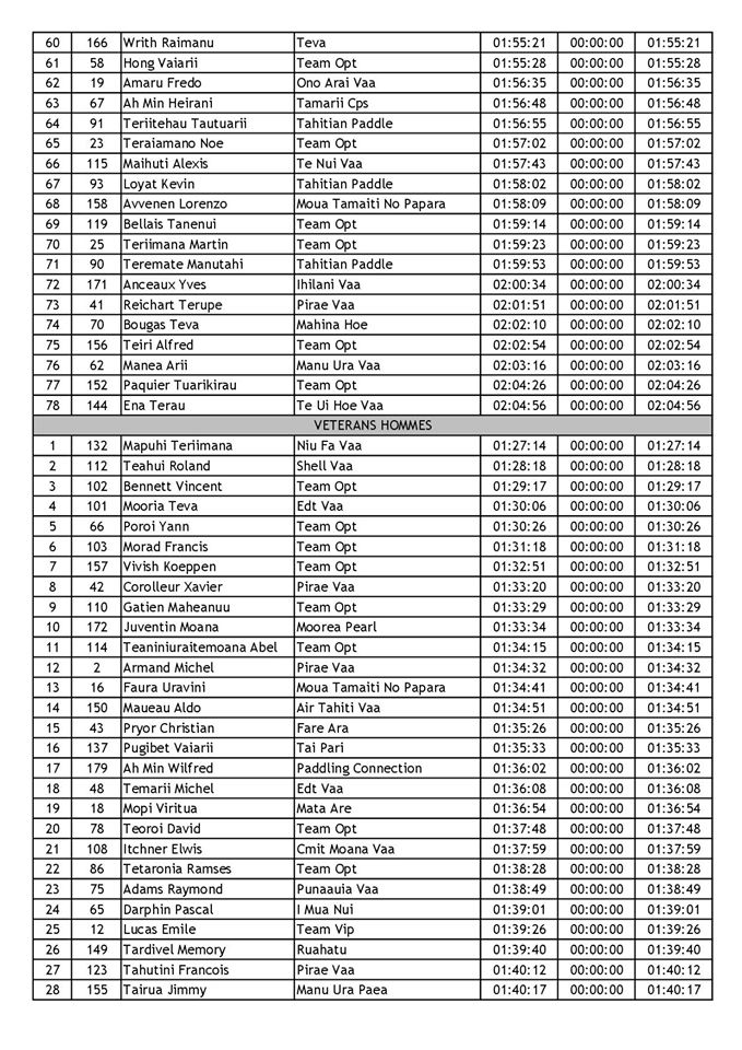 Joann Cronsteadt, qui n’est autre que le frère de Georges Cronsteadt, s’impose en 1H32’30, devant Kévin-Céran Jérusalemy en 1H32’42 et Kyle Taraufau en 1H33’42. En quatrième place on retrouve un 3e rameur de Shell Va’a, le kayakiste et ambassadeur Air Tahiti Nui Hiromana Florès qui devance Charles Tenauri et Steeve Teihotaata. Belle 7e place pour le Néozélandais Tupuria King, devant Pirifonia Tavi.