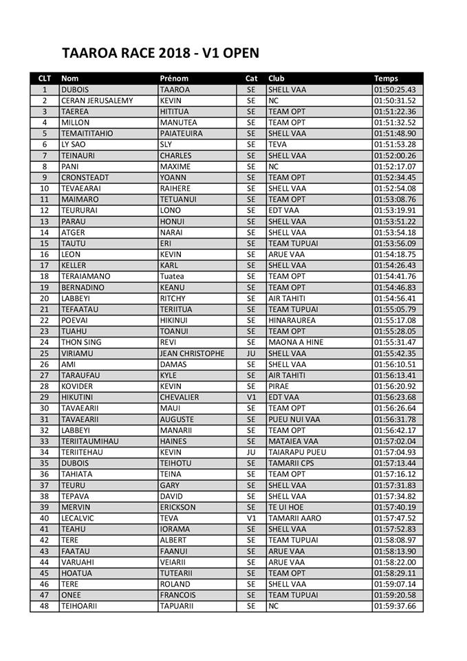 Pas moins de deux cent participants ont pris part à cette première course de la saison V1 organisée par le club Tahitian Paddle. Le site du Parc Vairei a été préféré cette année au site d’Orohiti. Taaroa Dubois, qui est à l’origine de l’organisation de cette course, s’est imposé en bouclant le parcours de 23 km en 1’50’’25, devant Kévin Céran-Jérusalémy et Hititua Taerea. Chez les plus jeunes, Tahaki Tehei s’impose chez les cadets, Manarii Faua chez les minimes et Matau Teauroa chez les benjamins. SB / FTVAA