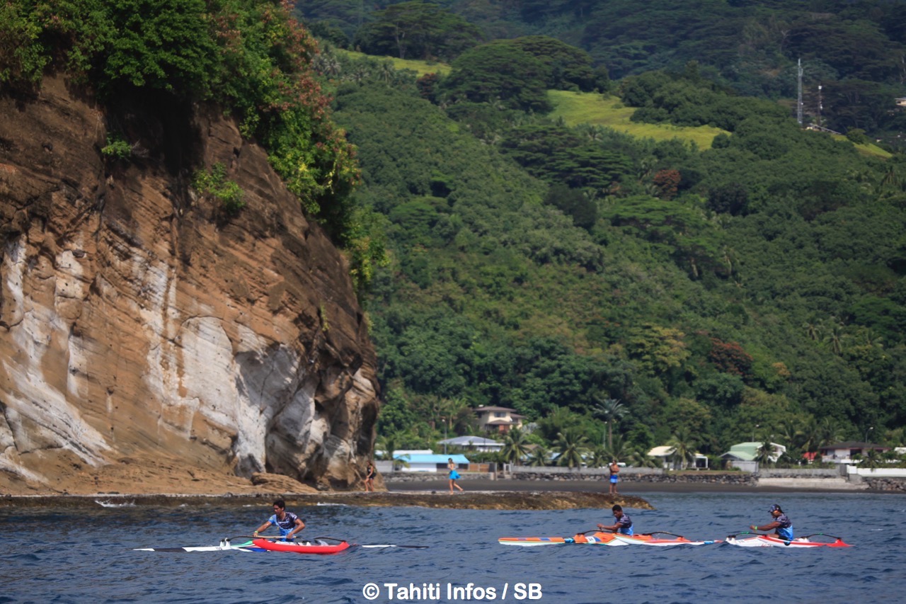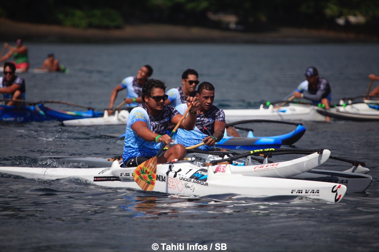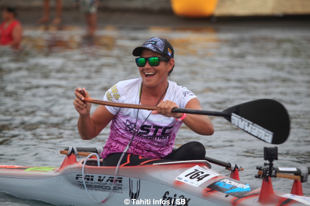 Kévin Céran-Jérusalémy n’a pas rapidement pris la tête de la course. Au moment de contourner le « Toa Hiro », la patate située au niveau de la plage de la Pointe Vénus, il était à la 4e place derrière le jeune Revi Thon Sing, Damas Ami et Paia Tamaititahio. Joann Cronsteatd est alors 5e. Kévin va faire son effort dans la « descente » en bénéficiant de la petite houle arrière. Lui qui se dit « moyen en tout », et donc pas vraiment spécialiste du surf, va réussir à prendre la tête de la course avant la dernière boucle en lagon.
