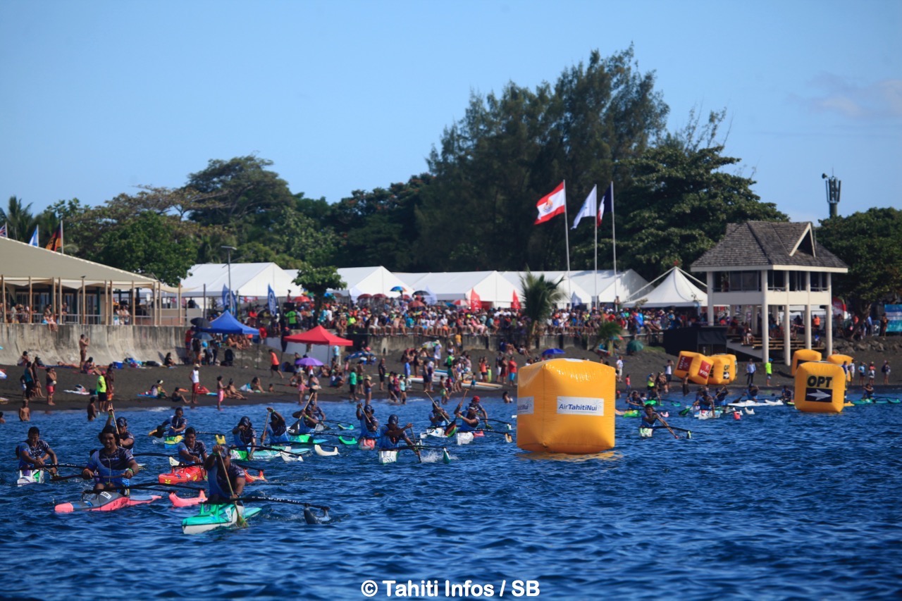 Le départ de la catégorie reine, la catégorie open homme, a été donné samedi à 14H. Plus de 400 pirogues V1 étaient alignées au départ qui a été donné au large de la baie du Taaone en direction de la pointe Vénus. Le départ a été quelque peu laborieux et chaotique. En 2018, les travaux de la pointe Vénus seront finis et le départ pourra y être donné, comme chaque année.
