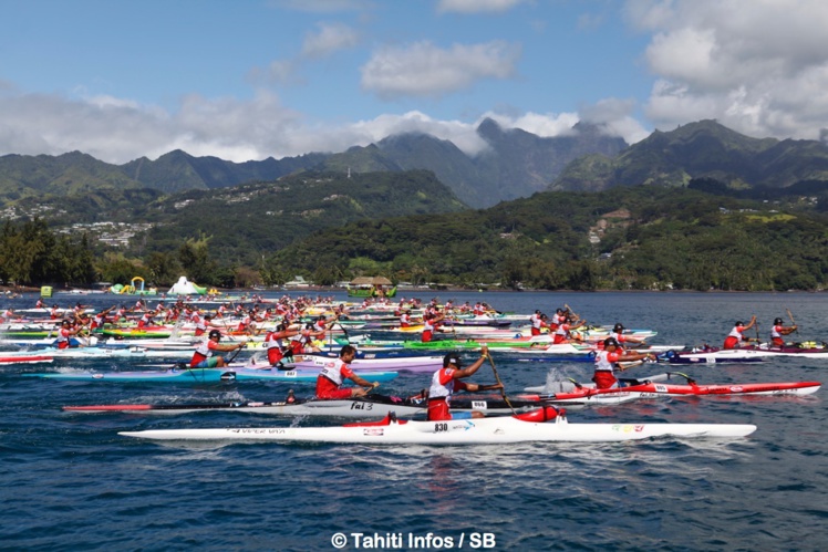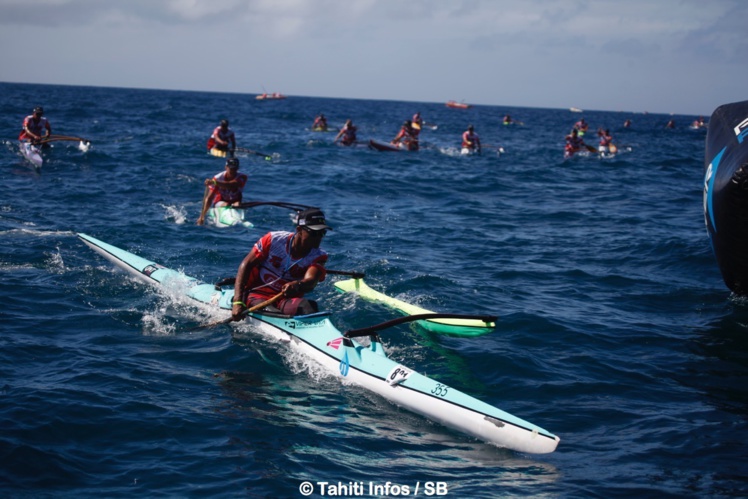 Après un faux départ, un deuxième départ a pu être donné. Les rameurs sont partis en courant de la plage avant de s’élancer dans l’eau avec leur embarcation pour réaliser le parcours, une boucle de 14 km. A l’aller, les concurrents ont pu être aidés par un vent relativement fort. A partir de la deuxième moitié de la « descente en downwind », quatre rameurs ont pu se retrouver en tête de course : Sly Ly Sao, Tutearii Hoatua puis Hotuiterai Poroi et Revi Thon Sing.