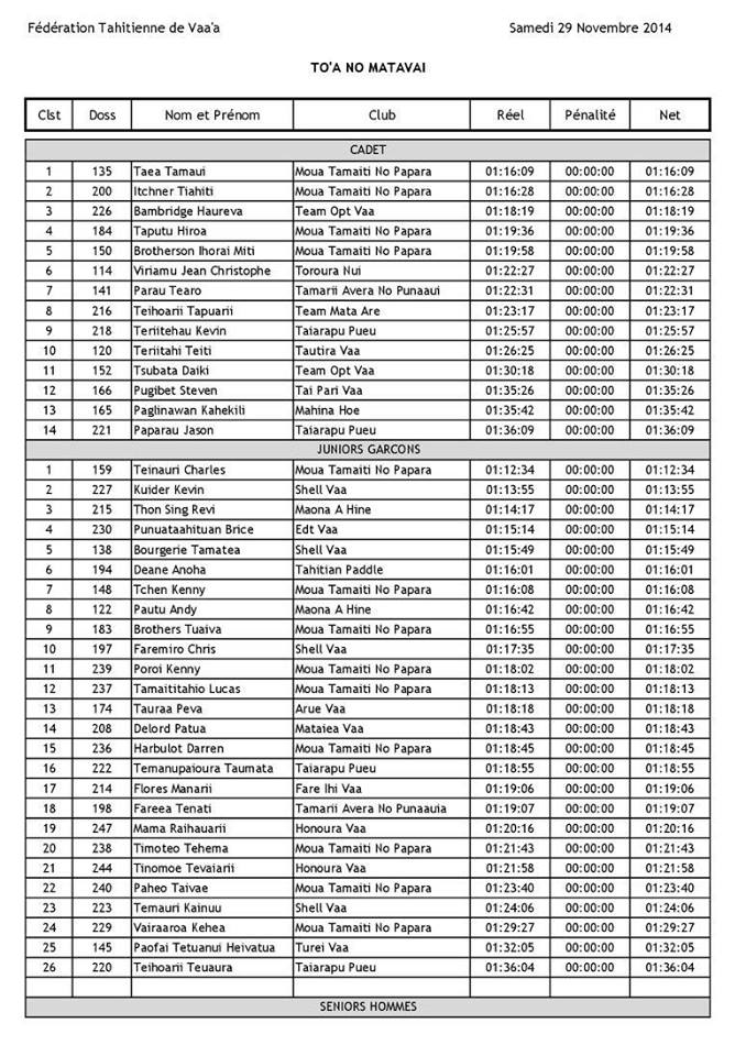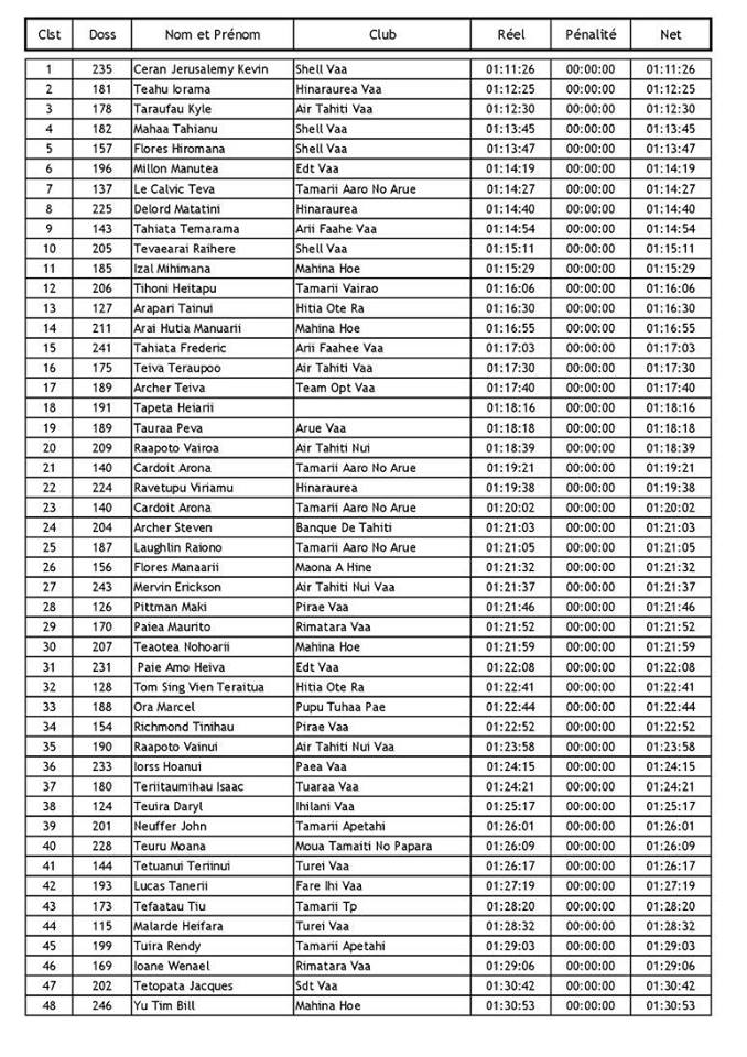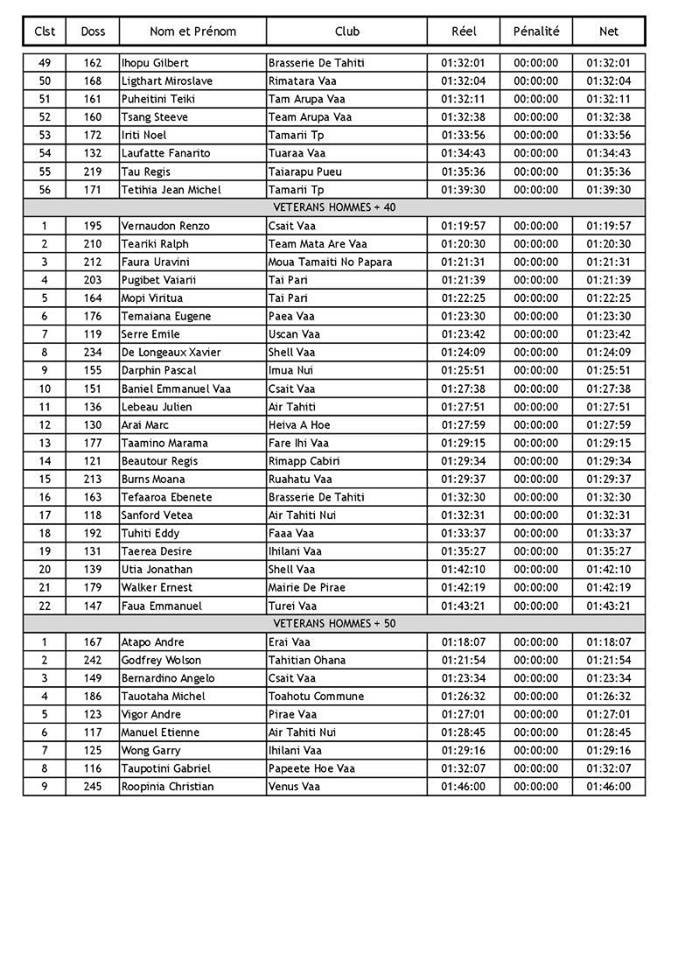 Renzo Vernaudon s’impose chez les 40 ans et +, André Atapo chez les 50 ans et +, Charles Teinauri gagne chez les junior garçons. Cette course était également l’occasion pour l’association Mahina Hoe d’organiser une course de va’a V6 inter quartiers ainsi que plusieurs autres courses ‘pour le fun’. SB