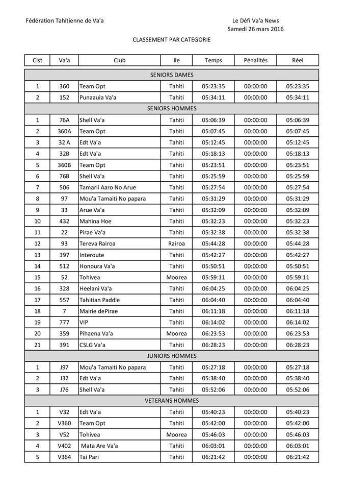Les hommes de Roland Teahui, l’entraineur de Shell Va’a, ont bouclé le parcours en 5H06'39''. Team Opt termine juste après en 5H07'45 et Edt Va'a arrive avec cinq minutes de retard sur Shell Va'a, 3e en 5'12'45. La deuxième pirogue de Edt Va'a arrive 4e, suivie de Team Opt B, 5e, et Shell Va'a B, 6e. Les changements et les auto-videurs étaient autorisés.