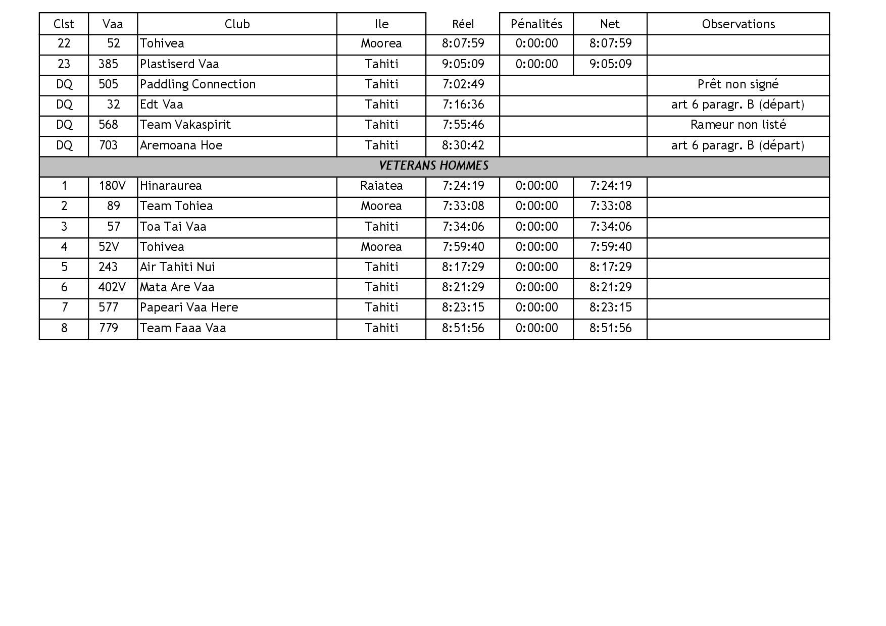 Deux autres V6, Taatira No Aimeho Nui et Honouru, ont quant à elles écopé de 5 minutes de pénalité pour « fiche commissaire non rendue », comme Edt Va’a sur la deuxième étape de la Tahiti Nui Va’a. La fédération et les comités organisateurs des courses auraient-ils finalement décidé de serrer la vis ? On sait que sur certaines organisations, par exemple la Moloka’i Hoe à Hawai’i, le règlement est respecté et les sanctions strictement appliquées, notamment par rapport au protocole de départ.