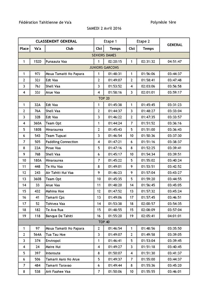 PUNAAUIA, le 2 avril 2016. La saison V6 poursuit son cours avec la deuxième course de la saison : Le Marathon Polynésie 1e, une course de 46 km qui s’est déroulée ce samedi, proposée par l’association Polynésie 1e Va’a. Sur le total des deux étapes c’est Team Opt qui obtient le meilleur chrono mais suite à une pénalité elle ne finit même pas sur le podium. C’est Edt A qui est déclaré vainqueur du Top 20, suivi de Shell A et d’Edt B.