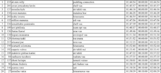 La course a débuté à 10h et c’est finalement Willy Ah Min qui s’impose. Willy est un rameur du team Paddling Connection, le team qui vient de perdre son titre à Hawaiki Nui en course marathon V6. En 2ème position on retrouve le champion de Shell Va’a Kevin Céran-Jérusalemy, vainqueur du Te Aito 2014, qui devance le 3ème Kyle Taraufau, un rameur du team Air Tahiti, originaire justement de Tautira, qui s’est également illustré cette année en remportant la Mata Are race en V1.