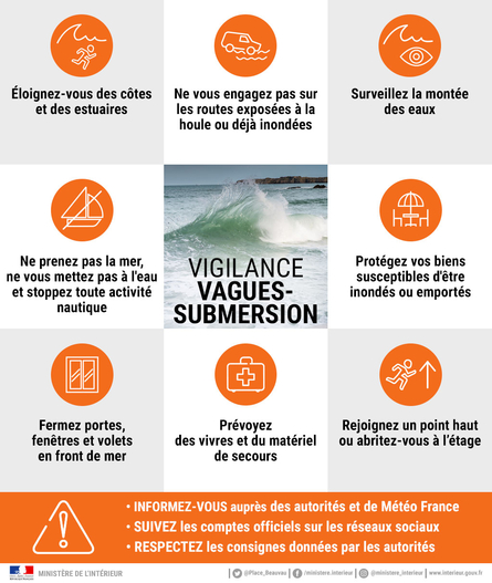 Tenez-vous informé de l'évolution du phénomène en consultant régulièrement les bulletins de Météo-France et appliquez les consignes des autorités :