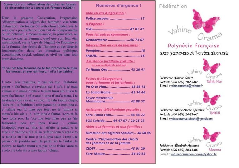 Vahine Orama est une fédération d’associations féminines apolitiques de type loi 1901 qui a pour objectif la défense de tous les intérêts liés à la femme: