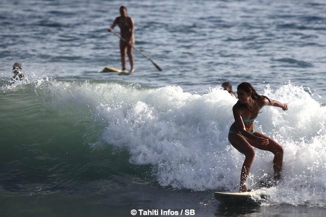 « Je fais donc du surf, je pratique un peu de yoga, de fitness, je faisais de la ‘pole dance’ et je fais de la danse tahitienne. J’ai commencé le surf grâce à Lorenzo. Cela fait un peu plus d’un an que je m’y suis mise, en décembre 2013. Cela m’a beaucoup plu et je n’ai pas envie d’arrêter. Je pense qu’une fois que l’on commence on ne peut plus s’arrêter ! Lorenzo m’avait prévenue ‘c’est une drogue, tu ne pourras plus t’en passer’, je ne l’avais pas cru et voilà ! Cela nous arrange car avant je m’ennuyais parfois à être spectatrice. Du coup on surfe ensemble, c’est fun. »