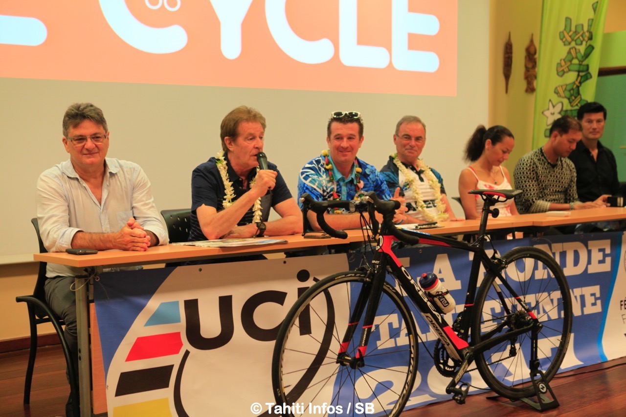 C’est Benoit Rivals, président du Vélo Club de Tahiti, qui a conduit cette conférence de presse à laquelle ont participé divers officiels et personnalités : Cécile Tiatia pour le ministère des sports, Antony Pheu directeur de l’IJSPF, Hironui Johnson pour le Ministère du tourisme, Michel Monvoisin PDG d’Air Tahiti Nui, le journaliste de France 2 Henri Sannier et le champion cycliste Bernard Hinault.