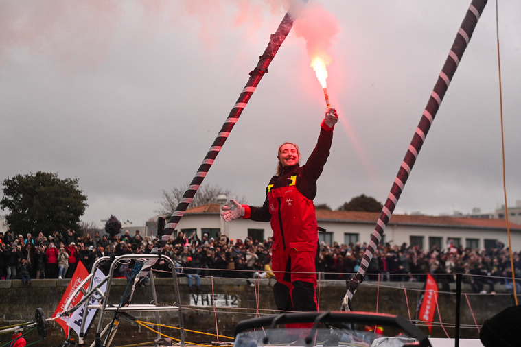 Il est un peu plus de midi quand la jeune femme de 23 ans entame sa remontée du célèbre chenal. Veste noire, salopette rouge, elle salue la foule depuis son voiler, grand sourire accroché aux lèvres et fumigènes en main, visiblement émue.