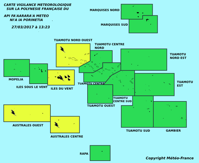 PAPEETE, le 27 mars 2017. Météo France a placé les Australes Centre, Australes Ouest, Iles du Vent et les Tuamotu Nord Ouest en vigilance jaune pour les orages. Les îles du Vent sont aussi en vigilance jaune pour fortes pluies.